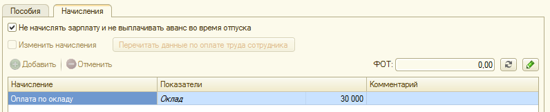 На закладке "Начисления" автоматически отменяется действие плановых начислений по заработной плате сотрудника на период отпуска.