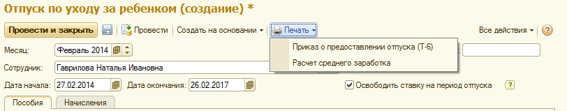 Отпуска по уходу за ребенком до достижения ими 3-х лет (предоставляемые в соответствии со ст. 256 Трудового кодекса Российской Федерации), а также государственные пособия на время отпуска в данной конфигурации регистрируются специальным документом "Отпуск по уходу за ребенком".