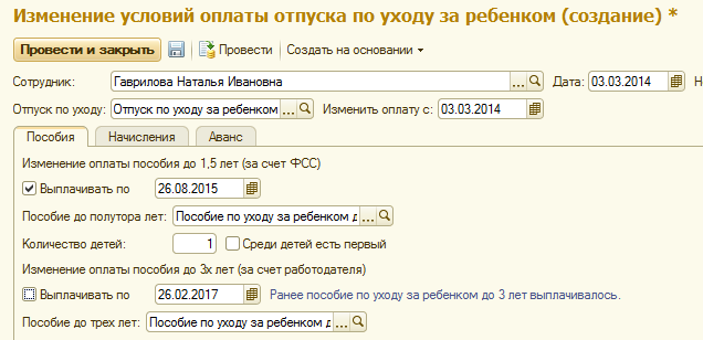 На основании документа "Отпуск по уходу за ребенком" можно ввести документ "Изменение условий оплаты отпуска по уходу" или "Возврат из отпуска по уходу", в который будут перенесены текущие условия выплаты пособий. Документ-изменение позволяет менять некоторые имеющиеся условия расчета пособий и другой оплаты, документ-возврат позволит досрочно прекращать отпуск по уходу за ребенком.