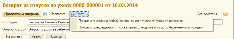 Возврат из отпуска по уходу". Документ прекращает начисление пособий, назначенных на период отпуска по уходу, и возобновляет обычные плановые начисления сотрудника.