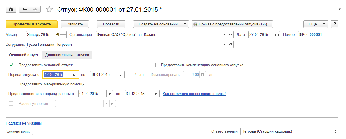 Периоды нахождения в основном и дополнительном отпуске регистрируются в документе раздельно.