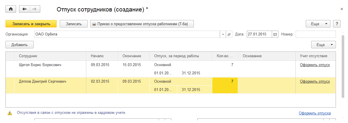 Документ предназначен для оформления отпусков нескольких сотрудников и печати соответствующего списочного приказа по унифицированной форме Т-6а.