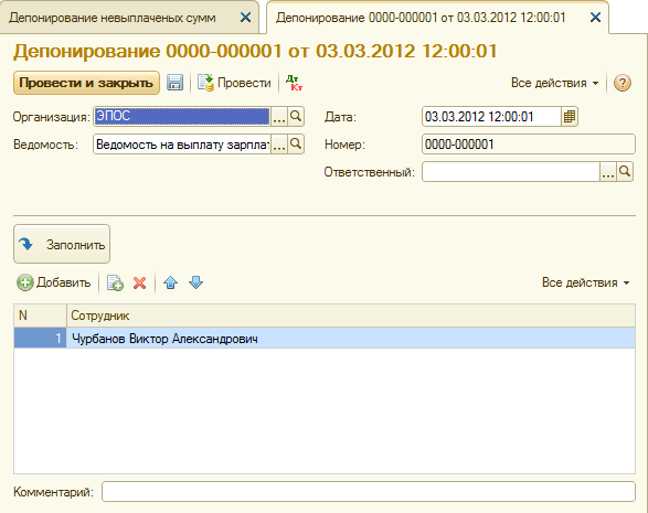 – через Панель разделов → Сотрудники и зарплата → Зарплата → Депонирование открыть список документов Депонирование невыплаченных сумм;