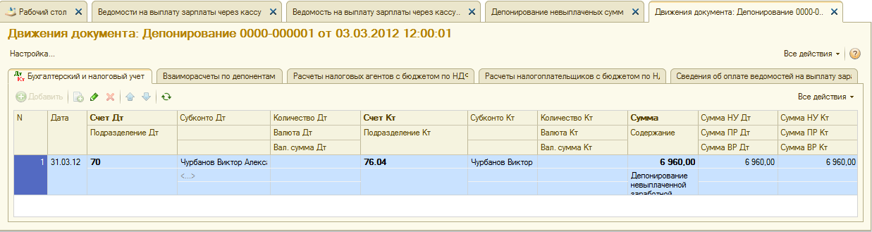 Проведение документа Депонирование приведет к формированию проводки в дебет счета 70 и кредит счета 76 на сумму начисленной заработной платы 6960 руб. Проводка, сформированная документом показана на рис. 12-29