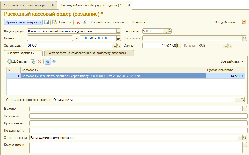 03.03.2012 кассир произвел выплату заработной платы сотрудникам Доскину Е.Д. и Шурупову Е.Л. по платежной ведомости № 1 от 28.02.2012 в сумме 14 531.00 руб.