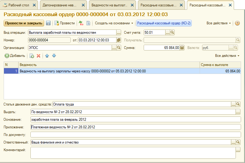 Необходимо выписать расходный кассовый ордер № 4 от 03.03.2012 на сумму, выплаченную по ведомости № 2 от 28.02.2012.