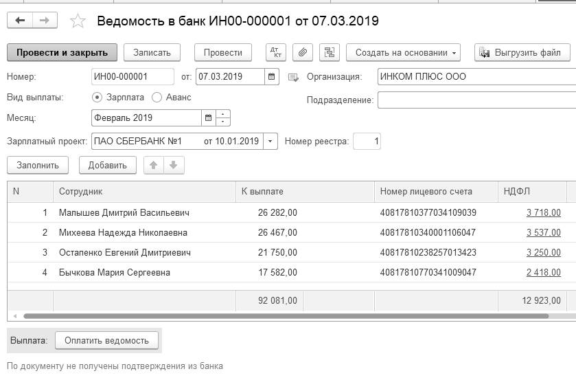 Шаг 5. 07.03.2019 года перечислите заработную плату в сумме 92 081 руб. контрагенту ПАО "СБЕРБАНК" за февраль платежным поручением (воспользуйтесь механизмом ввода на основании). Вид операции "Перечисление заработной платы по ведомостям". На основании платежного поручения сформируйте документ "Списание с расчетного счета". Суммы перечисляются без НДС. Документ должен сделать проводку: