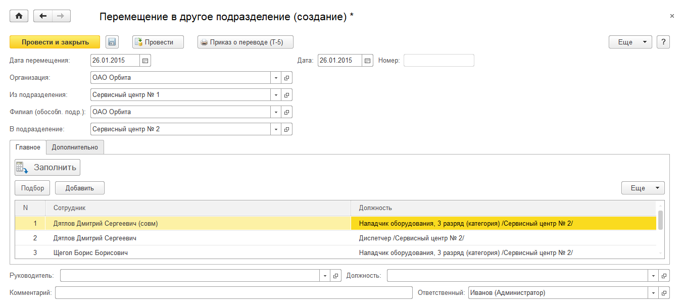 Перемещение в другое подразделение