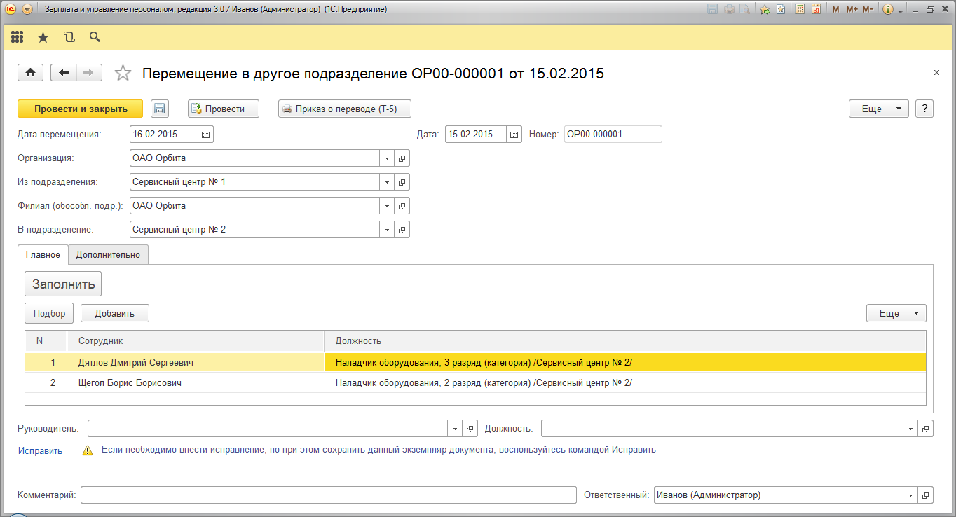С 16.02.15 все наладчики из Сервисного центра №1 переводятся в Сервисный центр №2 на соответствующие позиции. Необходимо зарегистрировать этот факт в программе.