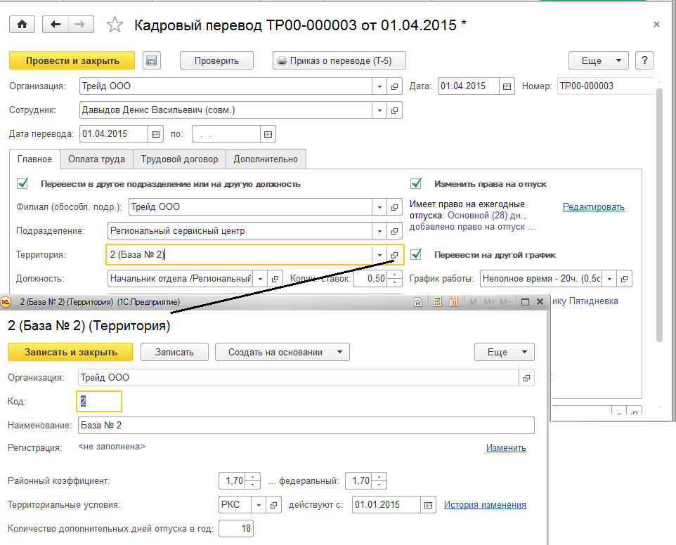 В программе реализована возможность перемещения сотрудников не только между подразделениями, но и между территориями с разным районным коэффициентом. Такая возможность включается в настройках учетной политики организации.