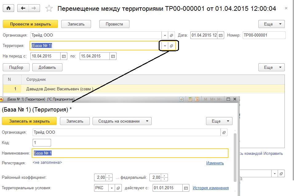 Например, сотрудник Давыдов Д.В. переведен на позицию начальника отдела в региональном сервисном центре. Ему при этом назначается территория – База № 2.