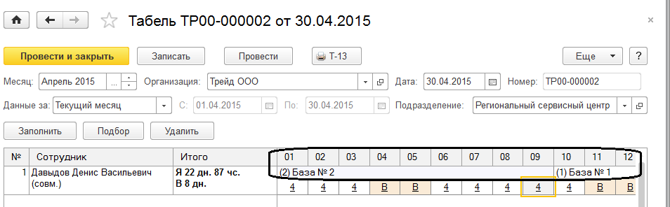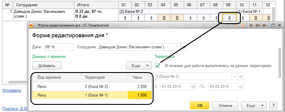 Если не введен табель учета рабочего времени, то работа на разных территориях в течение месяца будет учтена по графику работы. В табеле учета рабочего времени можно откорректировать рабочее время на той или иной территории, в том числе в рамках одного дня.