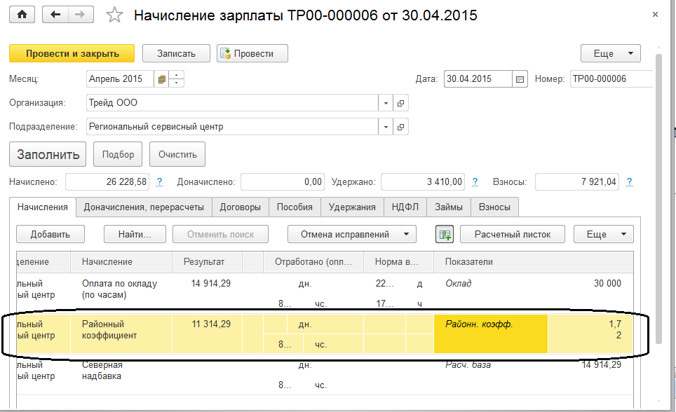 Например, в ООО «Трейд» есть региональный сервисный центр. С апреля в нем открыта новая позиция в штатном расписании. По этой позиции предполагается начисление районного коэффициента в размере 1,7, исходя из настроек подразделения.