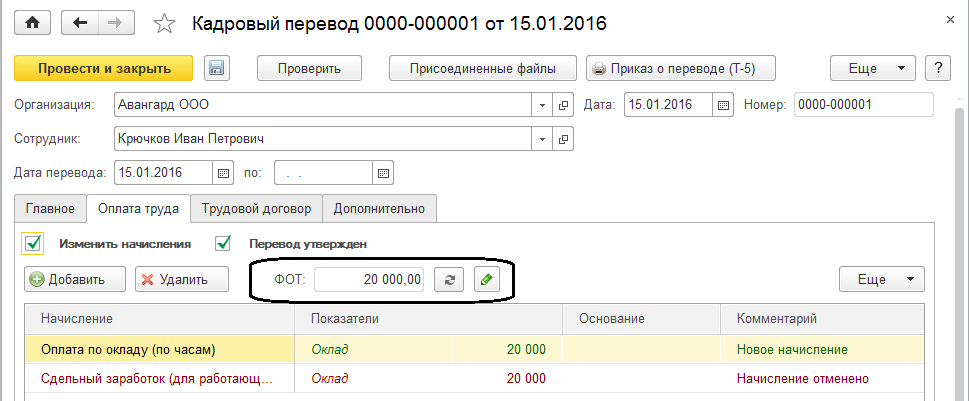 Фонд оплаты труда по штатной единице мы рассматривали в штатном расписании. Фонд оплаты труда (ФОТ) сотрудника складывается из его плановых начислений, а, следовательно, его можно увидеть, проанализировать и отредактировать при необходимости (если например, надбавка задается процентом от стажа, и показатель неизвестен) в документах по плановым начислениям.