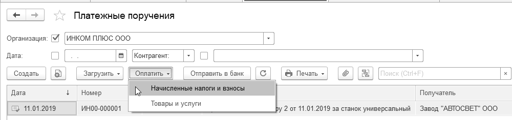 (меню "Панель разделов/Банк и касса/Панель навигации/Банк/Платежные поручения/Оплатить/Начисленные налоги и взносы/Уплата налогов")