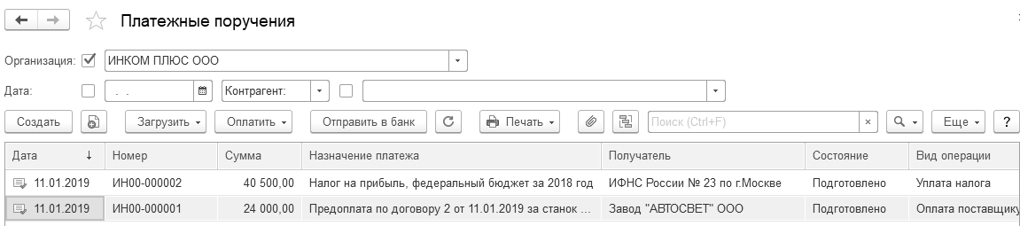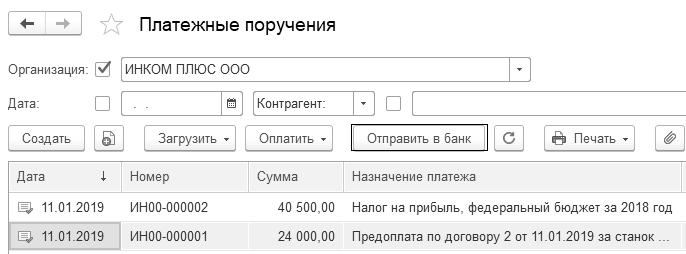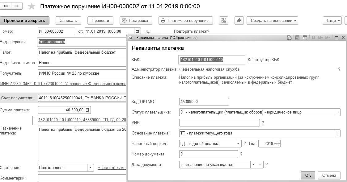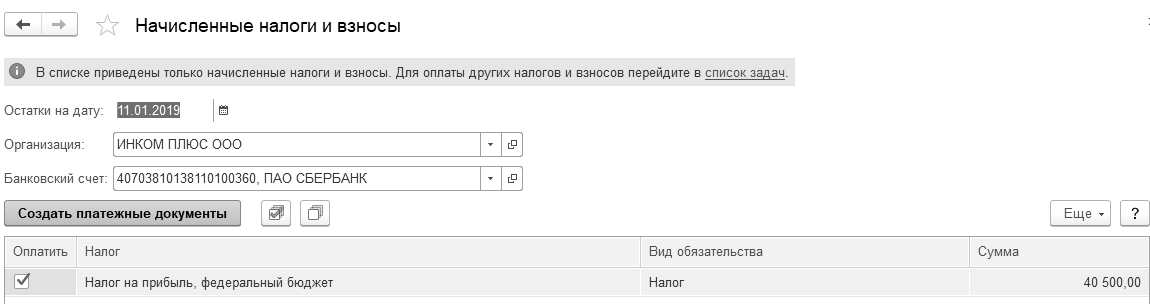 11.01.2019 года перечислите налог на прибыль в сумме 40 500 руб. в федеральный бюджет. Основание – уплата налога.
