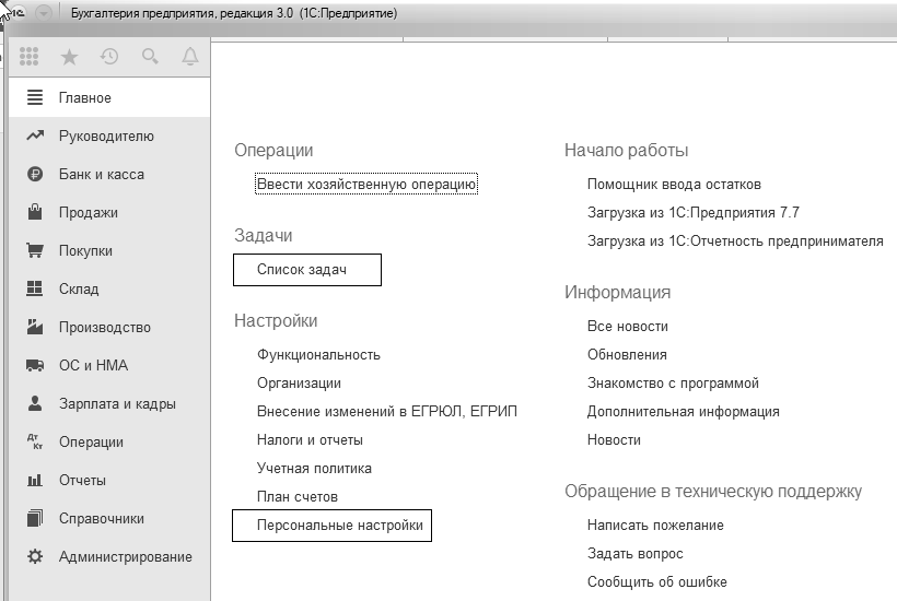 (меню "Панель разделов/Главное/Панель навигации/Настройки/Персональные настройки")