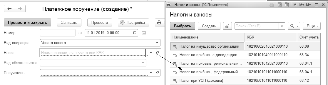 При изменении значений полей "Налог" и "Вид обязательства" реквизит КБК динамически перезаполняется.