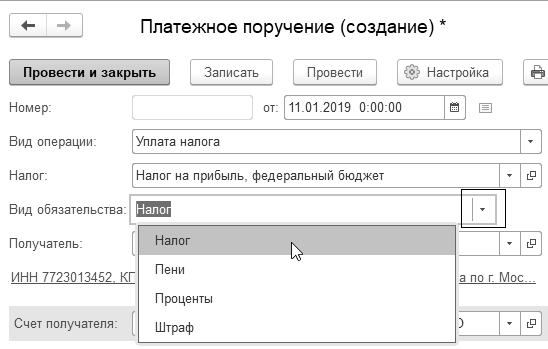 В документе "Платежное поручение" есть реквизит "Вид обязательства", которое может принимать значения, указанные на рисунке 8.3.5.