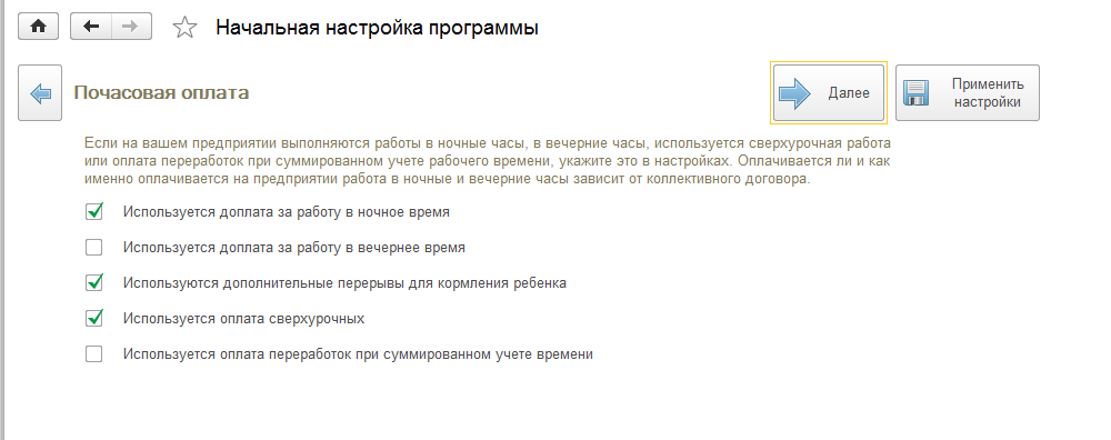 Кроме точности размера оплаты, настройки соответствуют настройке программы в разделе "Расчет зарплаты / Настройка состава начислений и удержаний / Почасовая оплата".