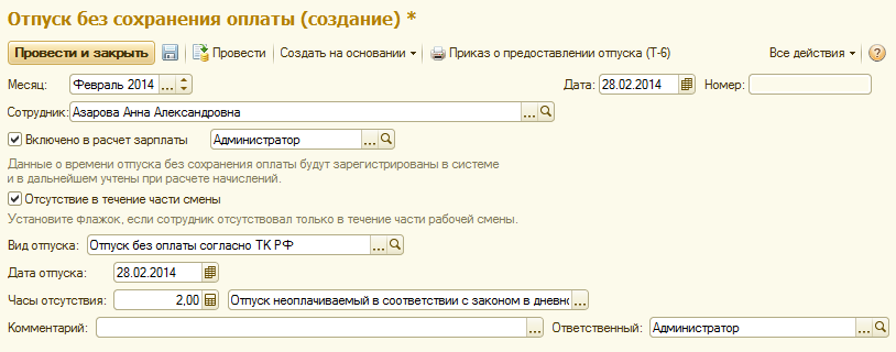 В некоторых документах ("Оплата по среднему заработку", "Отпуска без сохранения" и т.д.) существует возможность регистрации почасовых внутрисменных отклонений. Такая возможность должны быть включена в настройках программы.