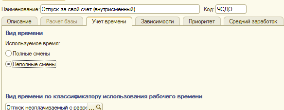 При этом в списках начислений доступны начисления с настройкой вида времени "Неполные смены".