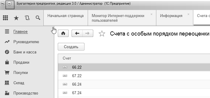 Рис. 8.5.1. Форма панели разделов "Справочники". Счета с особым порядком переоценки