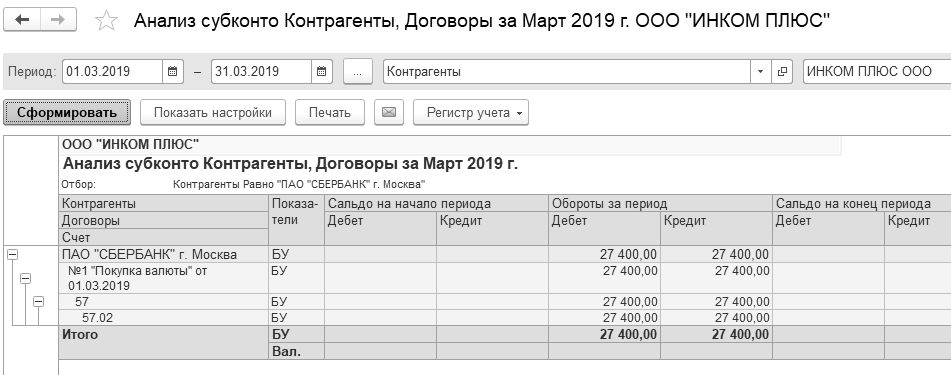 - Установите отбор по контрагенту "СБЕРБАНК" и договору "Покупка валюты". Сформированный отчет "Анализ субконто" проверьте по рисунку 8.5.8.