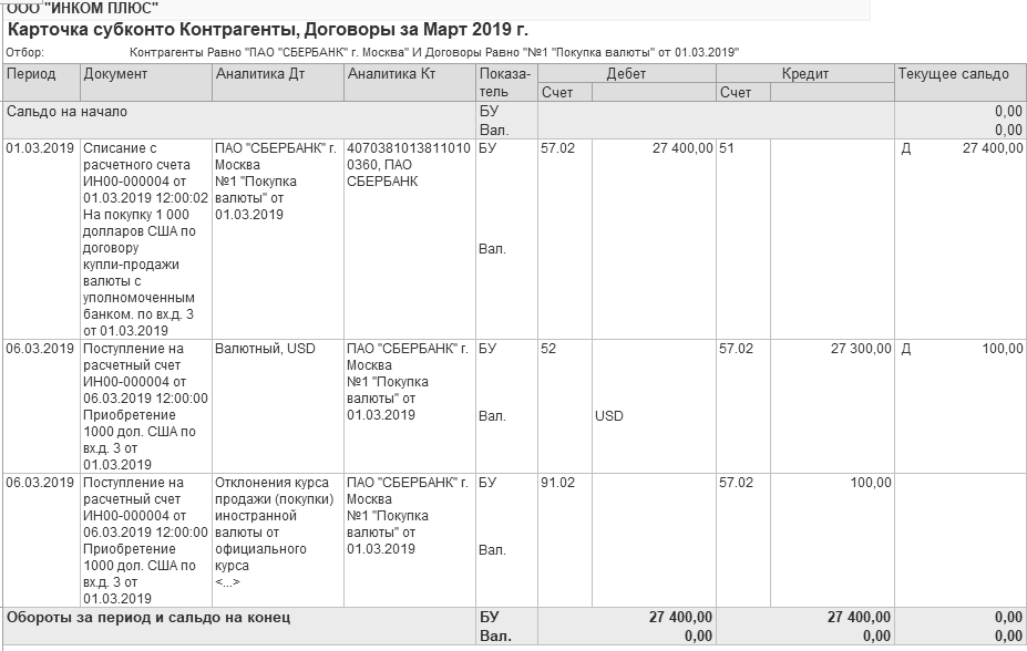 На валютный счет 06.03.2019 года зачисляется приобретенная валюта (1 000 долл.). Курс ЦБР на 06.03.2019 года составляет 27,30 руб. за 1 USD[1].