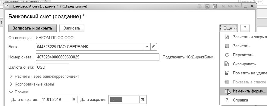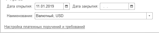 И хотелось бы наименование счета указать не цифрами, а произвольным образом (например, валютный счет, USD). Заполните указанную информацию, ориентируясь на рисунок 8.5.2. Запишите и закройте элемент.