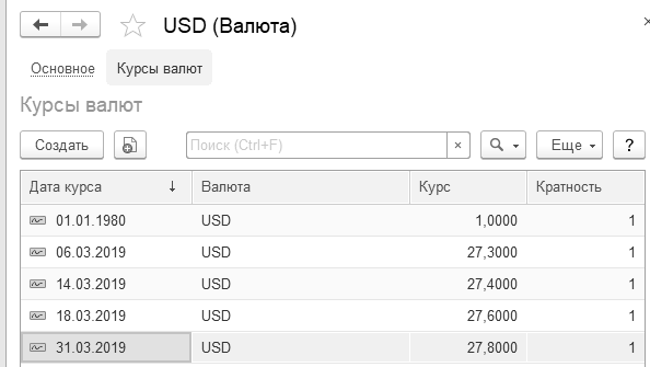 В справочнике "Валюты" откройте форму "Доллар США". По условию задания методического материала курс валюты вводится вручную, т.к. он условный, и не загружается из интернета. Чтобы указать курсы на нужную дату необходимо воспользоваться гиперссылкой "Курсы валют" и при помощи кнопки "Создать" занесите курсы. Если в справочнике есть курсы, занесенные программой автоматически, их следует удалить сочетанием клавиш Ctrl + A (рис. 8.5.3).