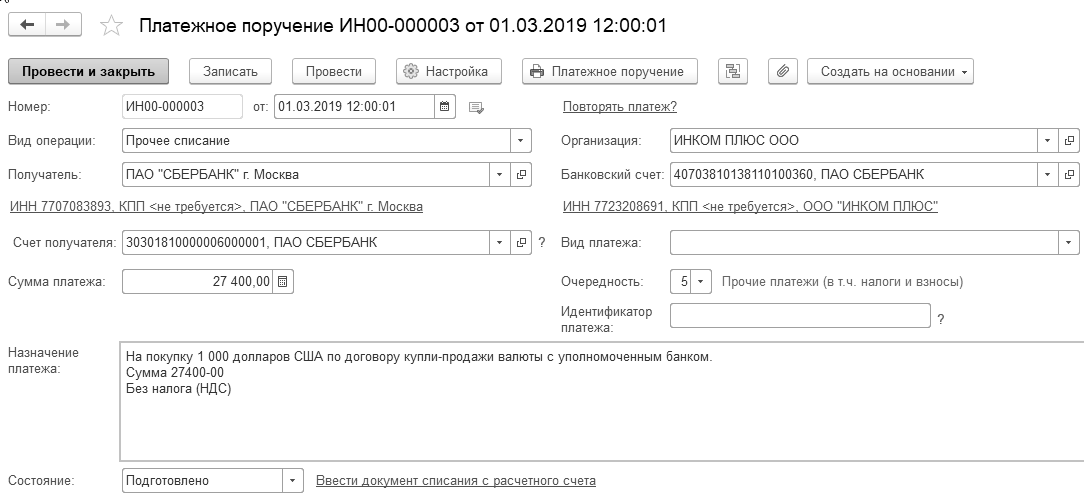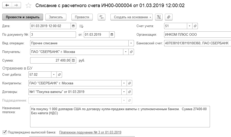 По договору купли-продажи валюты с уполномоченным банком с основного расчетного счета 01.03.2019 года перечислено 27 400 руб. на покупку 1 000 долларов США. Валюта покупается на нужды организации (оплату товара).
