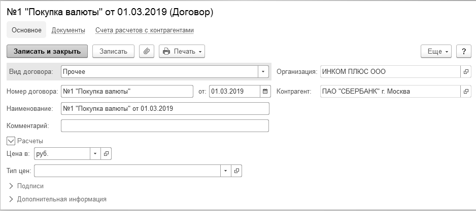 Для контрагента "СБЕРБАНК" (ПАО)" создайте договор "Покупка валюты" под номером 1 от 01.03.2019 года. Форма договора представлена на рисунке 8.5.5.