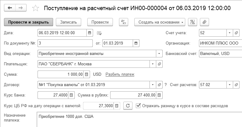 06.03.2019 года создайте документ "Поступление на расчетный счет". Входящий номер документа № 3 от 04.03.2019 года. Договор № 1 от 01.03.2019 года "Покупка валюты".