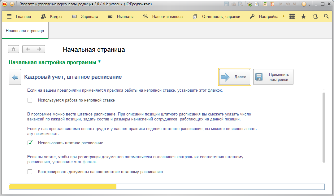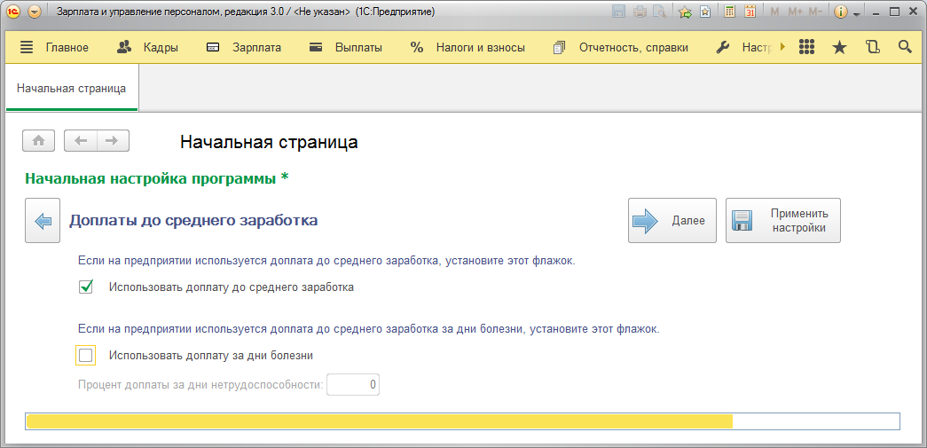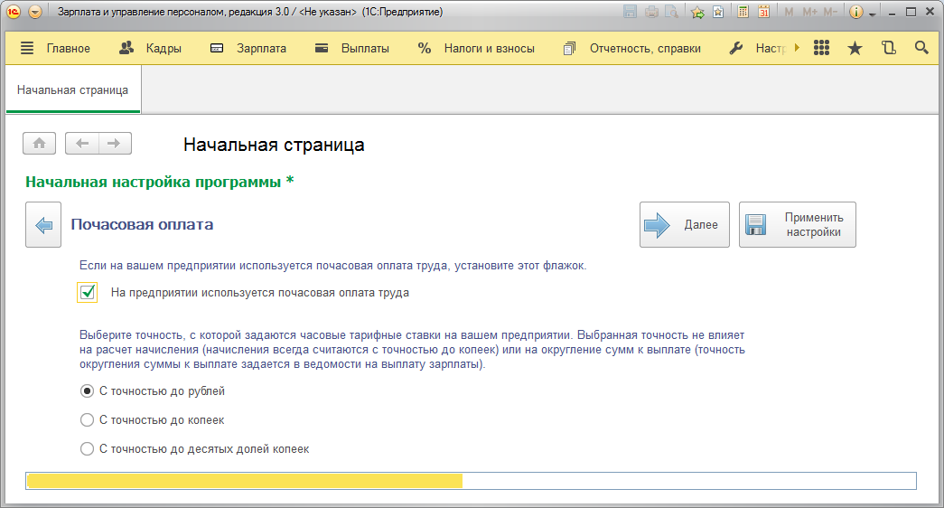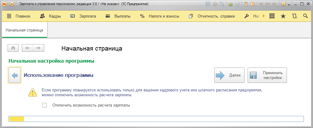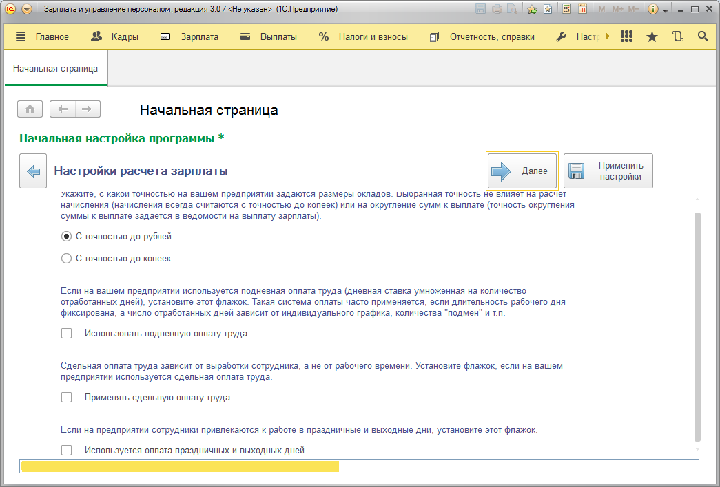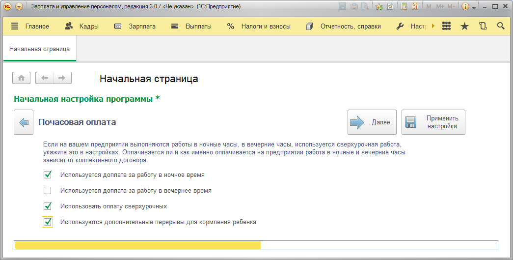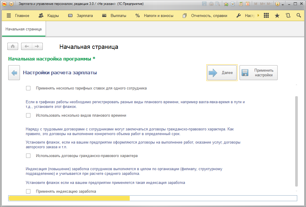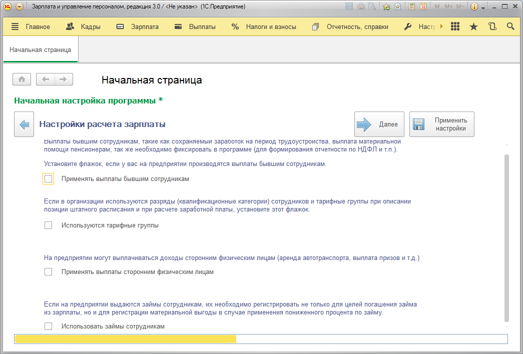 В помощнике начальной настройки можно указать, что на предприятии используются определенные начисления. В результате становится возможным назначение и выполнение этих начислений сотрудникам: