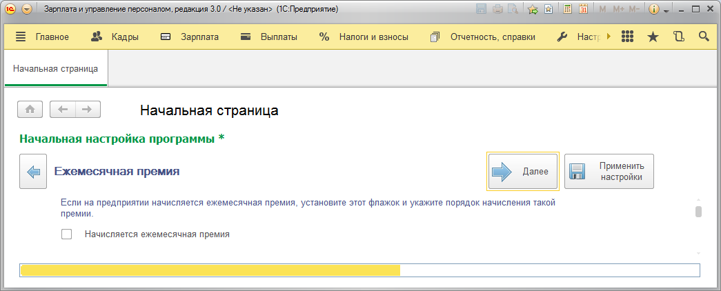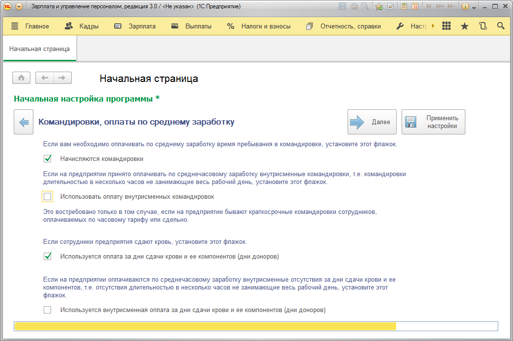 Если на предприятии системой оплаты предусмотрены премии и вознаграждения, которые, согласно законодательству, особым образом учитываются при расчете среднего заработка для отпусков, командировок и т. п., то этот факт можно отметить в помощнике начальной настройки. В результате в программе станут доступны для использования соответствующие начисления и документы.