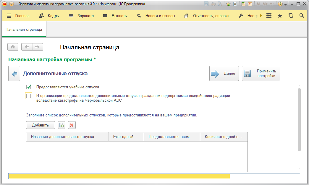 В программе имеется возможность регистрировать дополнительные оплачиваемые учебные отпуска, дополнительные отпуска Чернобыльцам а также другие виды дополнительных отпусков и производить их оплату по среднему заработку.