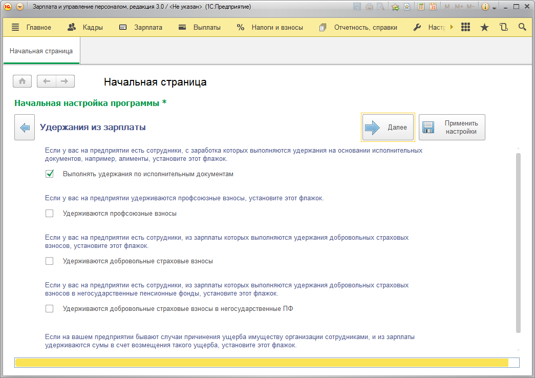 При выполнении первоначальной настройки имеется возможность указать использование на предприятии следующих видов удержаний:
