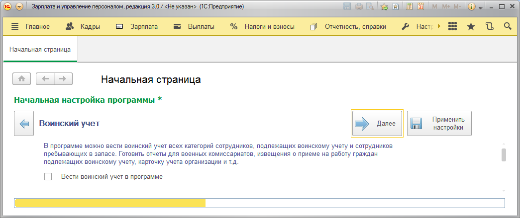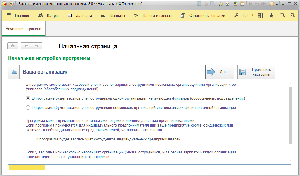 Часть возможностей востребована всеми предприятиями практически без исключения, но не всем предприятиям требуются абсолютно все предусмотренные в ней возможности. Поэтому при начале работы с программой имеется возможность явно указать, какая функциональность требуется для ведения учета на данном конкретном предприятии, где внедряется программа.