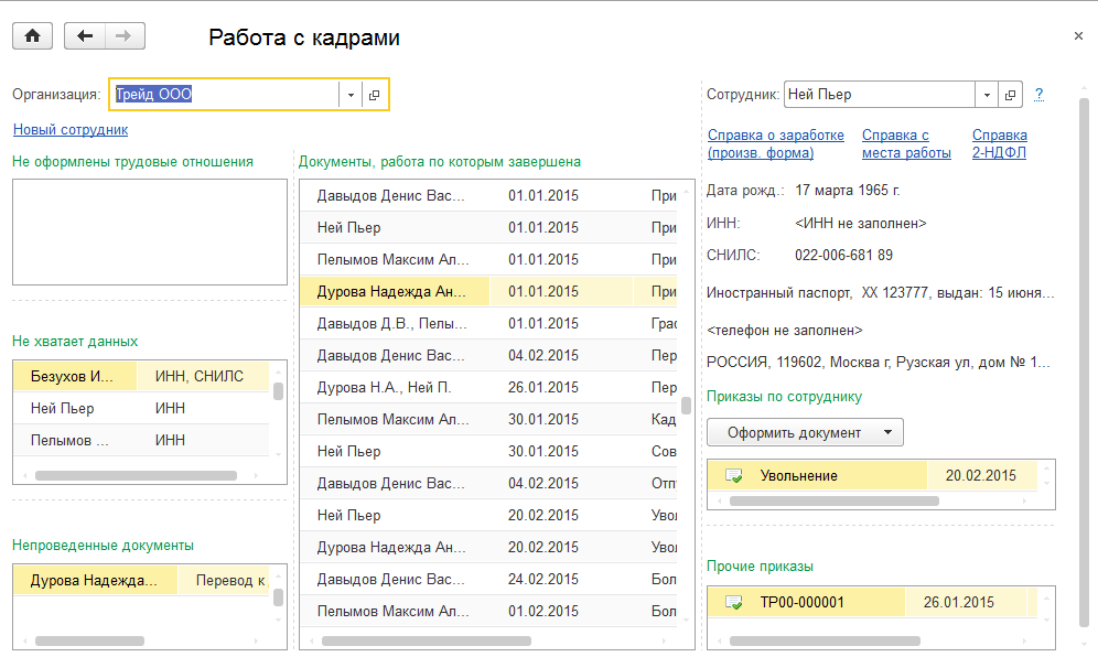 Помощник работы с кадрами (раздел «Кадры / Работа с кадрами») позволяет просматривать, вводить и редактировать кадровые приказы, контролировать заполнение личных данных сотрудников, выявлять непроведенные документы.