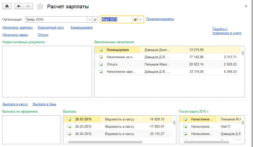Помощник работы с зарплатой (раздел «Зарплата /Расчет зарплаты») позволяет анализировать нерассчитанные документы, введенные кадровой службой, просматривать выполненные начисления и выплаты (в том числе документы следующих месяцев), анализировать задолженность.