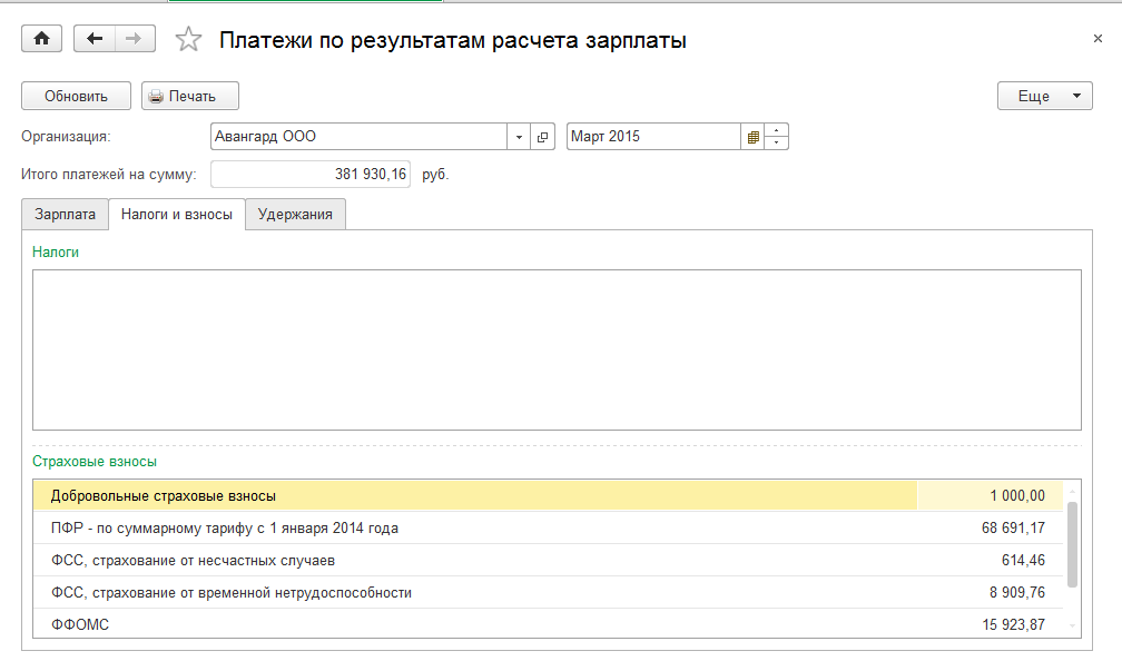 Помощник формирования платежей по результатам расчета зарплаты (раздел «Выплаты/ Платежи, перечисления») позволяет проанализировать контрагентов, в пользу которых производились удержания, суммы страховых взносов, документы по выплате зарплаты через банк по зарплатному проекту и т.п.