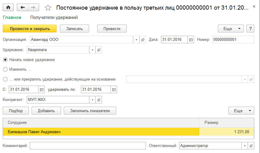 Сотрудник ООО "Авангард" Балмашов П.А. попросил удерживать кварплату из заработка и перечислять ее в МУП ЖКХ. Сумму квартплаты будут присылать ежемесячно по электронной почте. В январе сумма квартплаты составила 1231 руб. Для этого из раздела "Зарплата / Алименты и другие удержания" создадим документ "Постоянное удержание в пользу третьих лиц" и заполним его как на рисунке ниже.