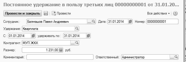 Документ "Постоянное удержание в пользу третьих лиц" предназначен для регистрации постоянного удержания каких-либо сумм из заработной платы сотрудника в пользу других контрагентов. Документ доступен при соответствующей настройке расчета зарплаты в программе.