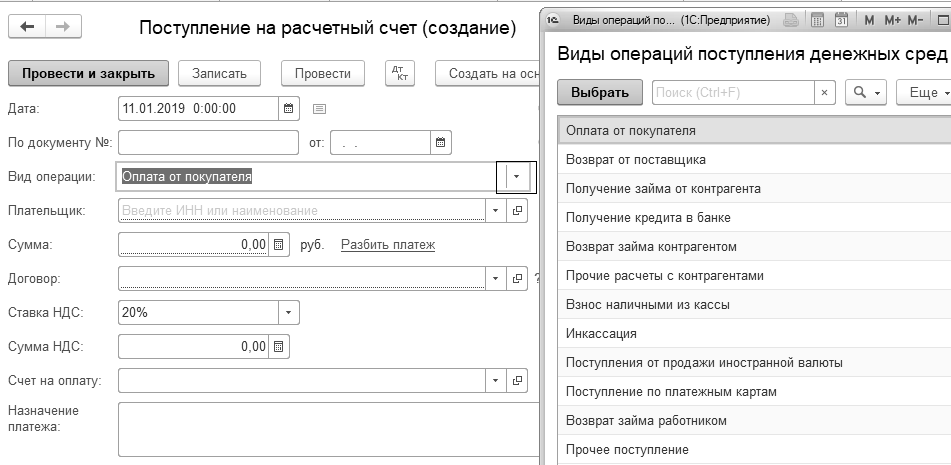 При создании документа "Поступление на расчетный счет" программа запросит выбрать вид операции (рис. 8.4.1.1).