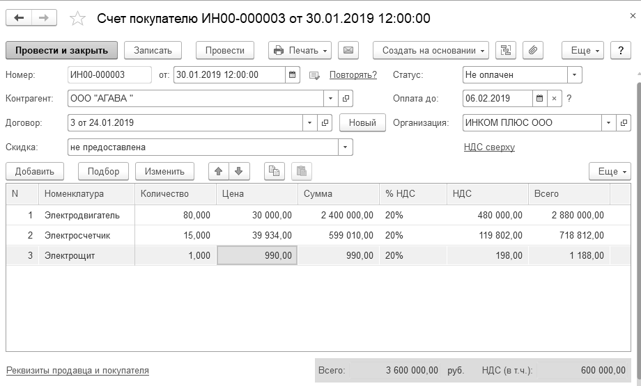 30.01.2019 года выписан счет для ООО "АГАВА" на товары по договору № 3 от 24.01.2019 года на сумму 3 600 000 руб., в т. ч. НДС 20%. Действует до конца этого года (рис. 8.4.1.10).