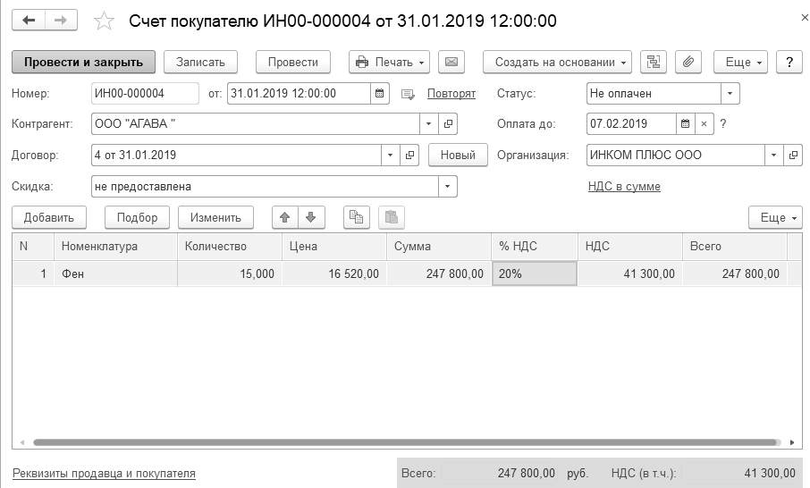 10.01.2019 года выставлен счет покупателю ООО "АГАВА" по договору № 2 от 09.01.2019 года на сумму 1 205 856 руб., в т. ч. НДС 20% - 200 976 руб. Настройте НДС сверху, так как цена номенклатуры приводится без НДС: