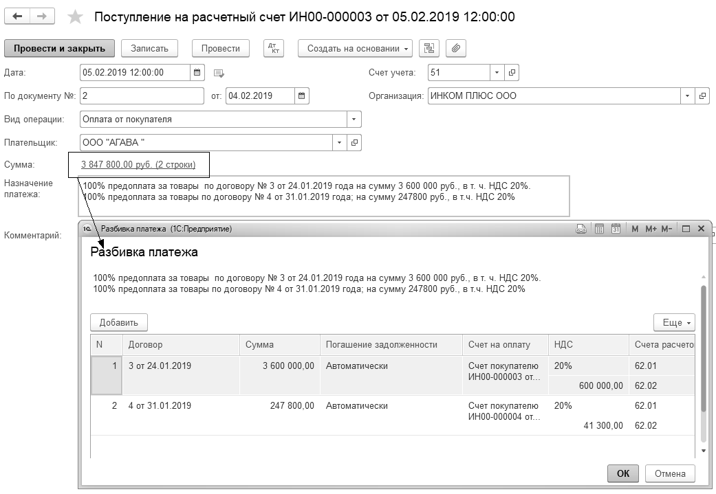 05.02.2019 года в ООО "ИНКОМ ПЛЮС" поступила банковская выписка, к которой приложено платежное поручение № 4 датой 04.02.2019 года от покупателя ООО "АГАВА" на сумму 3 847 800 руб. по договорам: