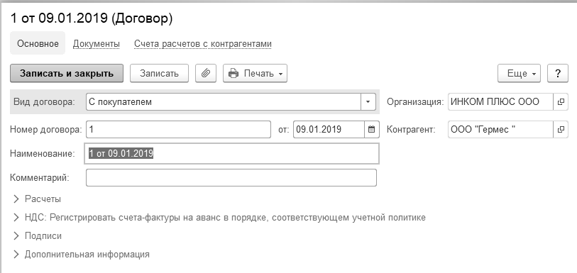 договор с контрагентом. Документ можно провести. На этом этапе изменяется состояние остатка денежных средств на расчетном счете организации.