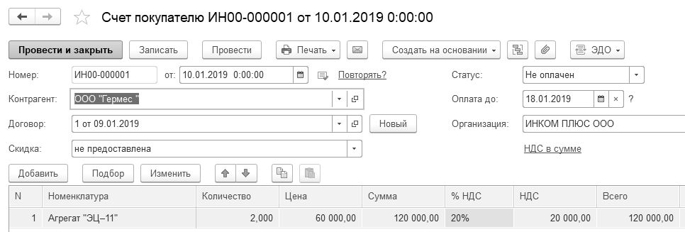 10.01.2019 года для покупателя ООО "Гермес" выписан счет на сумму 120 000 рублей, в т. ч. НДС 20% (20 000 руб.) по договору № 1 от 09.01.2019 года на продажу агрегатов "ЭЦ-11" в количестве двух единиц.